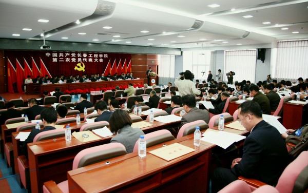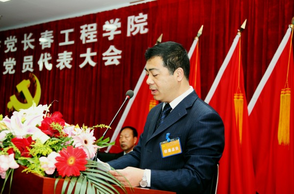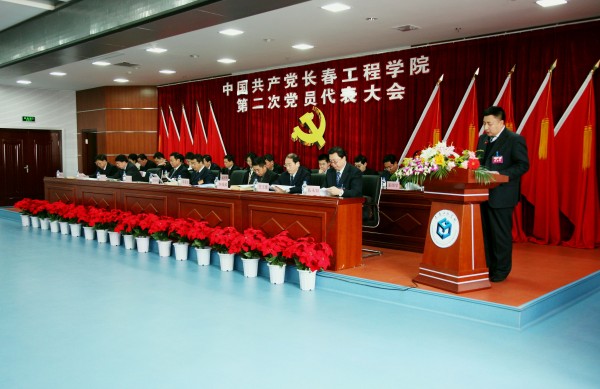 五月的春城,春潮涌动,生机盎然。逸夫图书馆报告厅内灯光璀璨,气氛隆重热烈。“中国共产党长春工程学院第二次党员代表大会”的会标在主席台上方熠熠闪光,帷幕正中是镰刀和锤头组成的党徽,10面鲜艳的红旗分列两侧。主席台前鲜艳的红花与党旗交相辉映。党员代表们肩负全校师生的重托出席大会,总结以往工作经验,共谋学校发展大计。