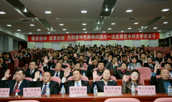 李春生同志在报告中围绕坚持以教学工作为中心,努力提高教学和科研水平;学习落实科学发展观,全面推进党的建设;加强思想政治工作,积极开展精神文明建设;以改革为动力,促进学校的发展与稳定;校庆活动取得圆满成功,社会影响力明显提升五个方面总结了过去五年学校工作取得的成绩和工作经验。在谈到今后的奋斗目标及发展任务时,李春生同志在报告中提出,我们的奋斗目标是:牢固树立教学工作中心地位,以增强办学实力、彰显办学特色、争取获得硕士学位授予权为目标,以提高教学质量、提高科研层次和总量、提高学科建设水平、加强师资队伍建设、创新管理机制为重点,以全面加强党的建设和思想政治工作为保障,充分调动全校师生员工的积极性和创造性,努力培养合格的社会主义建设者和接班人,为把学校建成特色鲜明的国内一流应用型本科大学而奋斗。