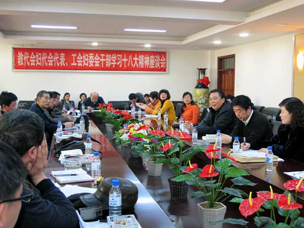 12月11日上午,校工会、妇委会在七教九楼会议室组织召开了学习党的十八大精神座谈会。纪委书记张未知参加座谈会并讲话。教代会代表、妇代会代表、工会委员、妇委会委员三十余人参加了座谈会。座谈会由校工会主席李文建主持。