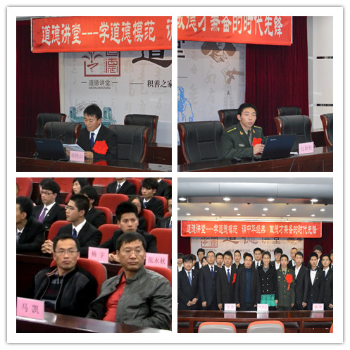 本次道德讲堂由我校“2013年感动校园人物”机电1042班学生邢艳山和“2012年长春市十佳大学生提名奖”获得者国防教育学院(管理学院)2010级学生包新柱为大家做事迹报告并共同分享了他们的奋斗历程。报告贴近学生生活,报告人情感真挚,收到了良好的效果。本次活动还安排了师生共同观看2012感动中国人物罗阳同志的先进事迹短片、朗诵经典、现场互动谈感想等环节。最后,道德讲堂在《道德歌》优美的旋律中圆满结束。