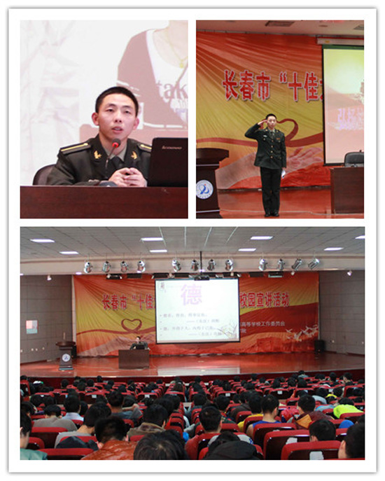 为充分发挥“十佳大学生”的引领示范作用,宣传和弘扬正能量,11月6日,由市高等学校工作委员会主办,长春市“十佳大学生”先进事迹报告团进校园宣讲活动在吉林体育学院学术报告厅隆重举行。由我校学生处推荐的2012年长春市“十佳大学生提名奖”获得者,我校国防教育学院10级国防生包新柱(管理学院)为在场的500余名大学生作了精彩的事迹报告。
