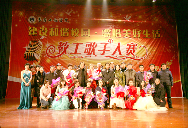 “建设和谐校园,歌唱美好生活”。为了展示学校教职员工的良好精神风貌,校工会、校团委联合举办了教工歌手大赛。大赛自举办之日起就得到了广大师生广泛关注,各分工会推选了22名选手参加初赛,共有12名教师进入决赛。在12月18日的决赛中,土木学院分工会荀红梅、水环学院分工会周玉斌、机关分工会王铁强获得一等奖;图书馆分工会朱晓姝、后勤分工会王彦卓、机电学院分工会张晓庆、图书馆分工会杨洋获得二等奖;土木学院分工会丁长鑫、建设学院分工会李胜男、机电学院分工会刘辉、理学院分工会杨明、机关分工会杨雪获得三等奖。
