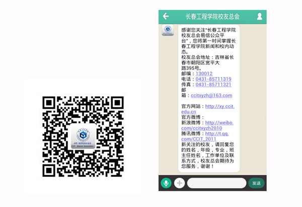 欢迎各地校友分会、广大校友、师生员工登录微信、易信扫描二维码或搜索“长春工程学院校友总会”关键词添加关注。