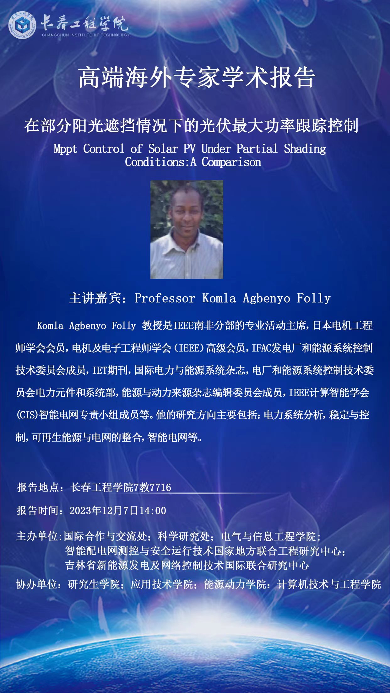 高端海外专家学术报告——在部分阳光遮挡情况下的光伏最大功率跟踪控制