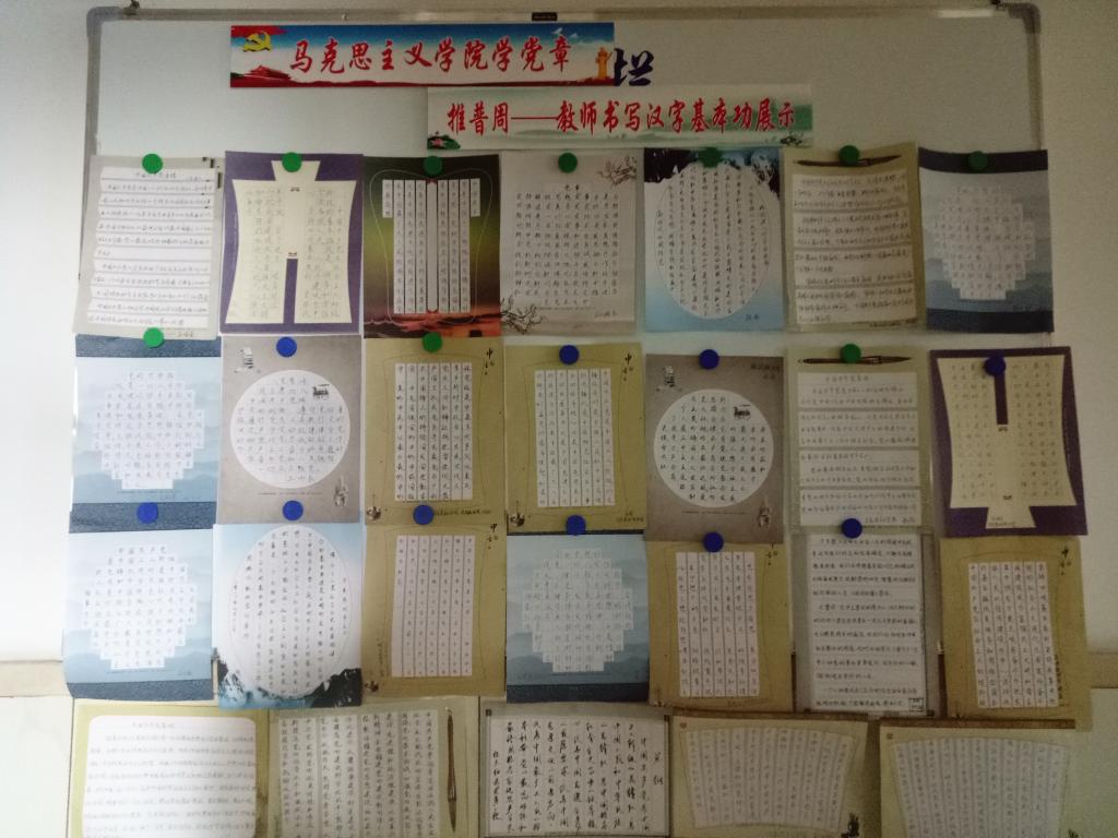 为了全面贯彻国家语言文字方针政策和法律法规,大力推广和规范使用国家通用语言文字,我校举办了推广普通话宣传周活动。为响应该项活动,马克思主义学院于9月初在本院范围内开展加强教师基本功——硬笔书写党章内容活动。学院还开辟专栏展示了老师书写的作品。