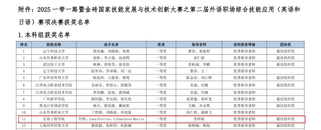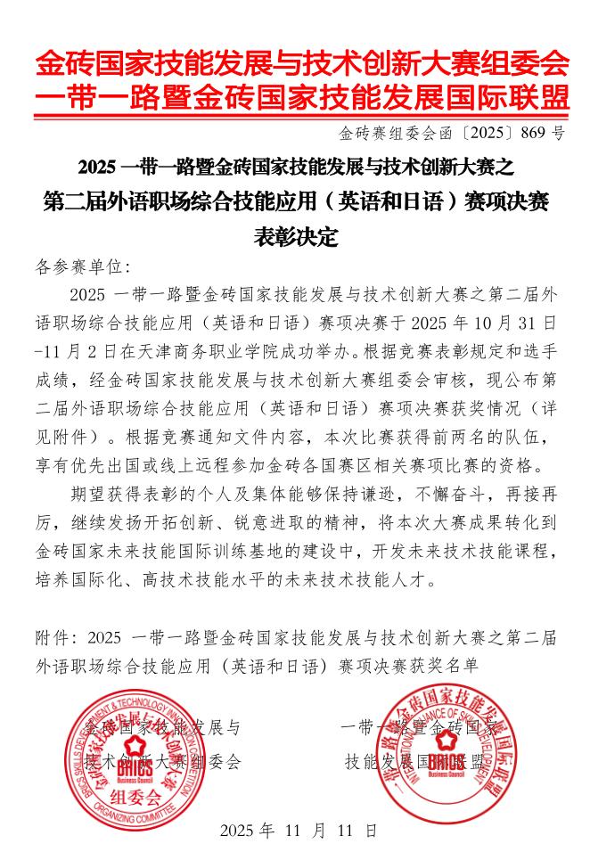 近日,2025一带一路暨金砖国家技能发展与技术创新大赛第二届外语职场综合技能应用(英语和日语)赛项决赛在天津商务职业学院举办。我校外国语学院选派的两支参赛团队表现卓越,从全国282支参赛队伍中脱颖而出,分别荣获全国一等奖和二等奖,充分展示了我校外语教学的扎实成果与学生出色的综合素质。