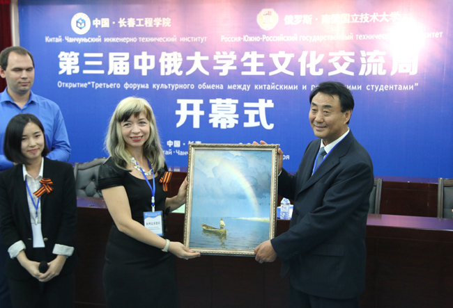开幕式首先播放了南俄国立技术大学和长春工程学院校歌。我校国际教育学院院长胡静波致辞,对南俄国立技术大学师生的到来表示热烈的欢迎与诚挚的问候。学生代表团带队教师阿列克桑德拉·谢尔宾诺夫斯卡娅老师宣读了南俄国立技术大学校长致韩立强校长的一封信,信中表示“南俄国立技术大学与长春工程学院缔结友好校际关系已有超过十五年的历史。在这十多年里,两校通过领导互访、教师培训、副博士学位论文答辩、文化交流等活动全面提升了双方的合作空间和专业水平。其中,最重要的合作成果之一,就是2015年能源与动力工程专业本科与硕士教育项目的实施。”南俄国立技术大学代表团向韩立强校长赠送了礼物。