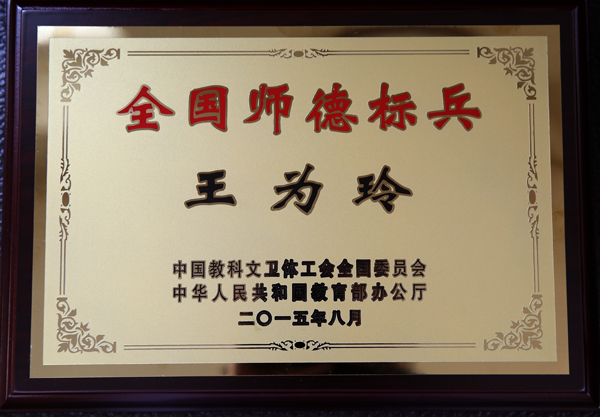 2015年教师节前,中国教科文卫体工会、教育部办公厅表彰了10名“全国师德楷模”、100名“全国师德标兵”。我校理学院教师王为玲副教授荣获“全国师德标兵”荣誉称号。