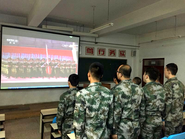 9月3日上午,纪念中国人民抗日战争暨世界反法西斯战争胜利70周年大会在北京天安门广场隆重举行。我校师生通过多种方式观看了现场直播。其中,国防教育学院组织全体留校国防生在七教7605教室通过网络集体收看了阅兵式的直播。上午十点,阅兵式正式开始,教室里响起了热烈的掌声,当听到习近平主席的讲话中“正义必胜!和平必胜!人民必胜!”,当观看受阅方阵步伐威武豪迈走来,当望着装备方队展示新式武器驶过,国防生们深深感受到作为一名中国人的光荣和自豪。大家纷纷表示要以祖国为荣,牢记历史,珍视和平,不负学校的殷切培育,艰苦奋斗,提高自己的军事素养和本领,为祖国的强大、民族的昌盛贡献出自己的力量。