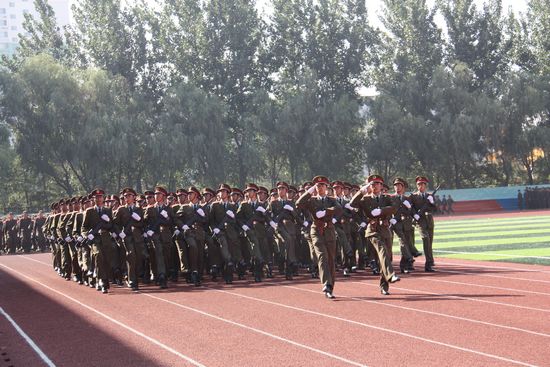 阅兵场上,绿草茵茵,彩旗飘扬,阅兵仪式正式开始。同学们口号嘹亮,身姿挺拔,青春的激情扑面而来,他们以昂扬的斗志,矫健的步伐,正步通过主席台接受检阅。不同的连队,同样的豪情,经过20余天军训的磨练,2010级新生们用黑脸庞、用汗水,更用纪律与坚持锤炼了自己的意志。