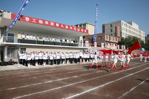 学校党委书记李春生宣布我校第九届田径运动会开幕。任玉珊副院长致开幕词。他说,这届运动会是在我校实施“质量立校、特色兴校、以人为本、科学发展”战略,全面落实科学发展观、深化管理体制改革、大力实施教学质量与教学改革工程、全面提升学校整体综合实力的新形势下举办的;他希望全体师生员工赛出竞技水平、赛出道德风尚、赛出个性风采,赛出团结友谊,赛出坚强意志,争取运动成绩和精神文明双丰收。
