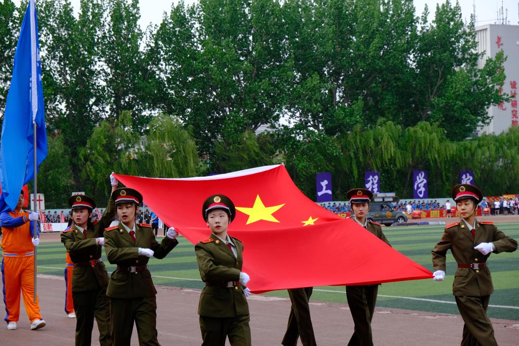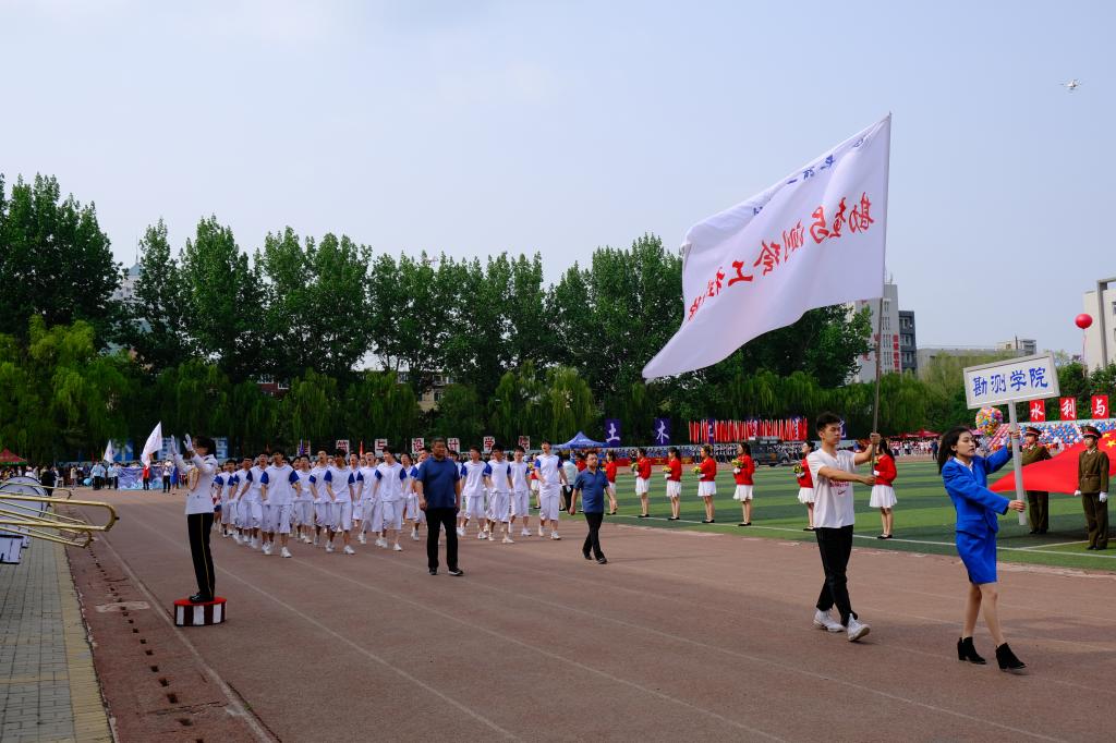 伴随着学校管乐团演奏的运动员进行曲,护旗队、刀旗队、花束队以及各学院运动员代表队英姿飒爽地通过主席台接受检阅。