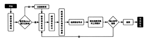 (三)网上报名采用全国计算机等级考试报名系统报名,考生自行登录报名网站http://ncre-bm.neea.cn进行报名操作。考生按系统提示进行账号注册,注册提交的个人信息必须真实、准确,注册成功后登录系统,填写个人基本信息、报考信息、上传本人近期免冠照片后确认报考信息,确认报考信息后考生点击报名页面上的支付按钮,报名页面将跳转到支付平台的页面,按照支付平台的提示信息完成考试费支付。支付成功后,即确认为报名成功,考生不能修改报考信息或退考退费。考生必须在报名时间范围内完成报名和缴费。报名流程详见图1。