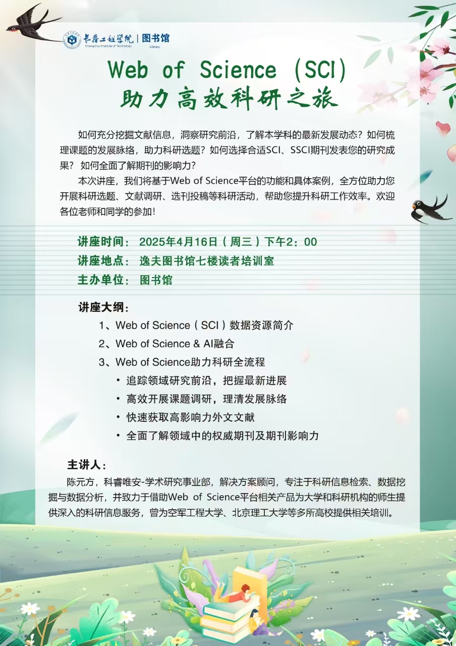 为了帮助同学们更好地利用国际权威学术资源,提升科研效率与成果质量,长春工程学院图书馆特别举办了本次“ Web of Science(SCI)助力高效科研之旅”专题讲座。本次讲座旨在深入探讨如何通过Web of Science平台优化文献检索、追踪研究前沿、管理学术数据以及提升论文影响力。
